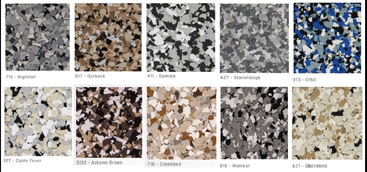 Color Charts Below 〰️ Color Charts Below 〰️ Color Charts Below 〰️ Flake Flooring Water-Based Stained Concrete Acid/Acetone Stained Concrete Quartz Flooring Metallic Pigments/ Metallic Flooring Neat Flooring Rubber Deck Flooring