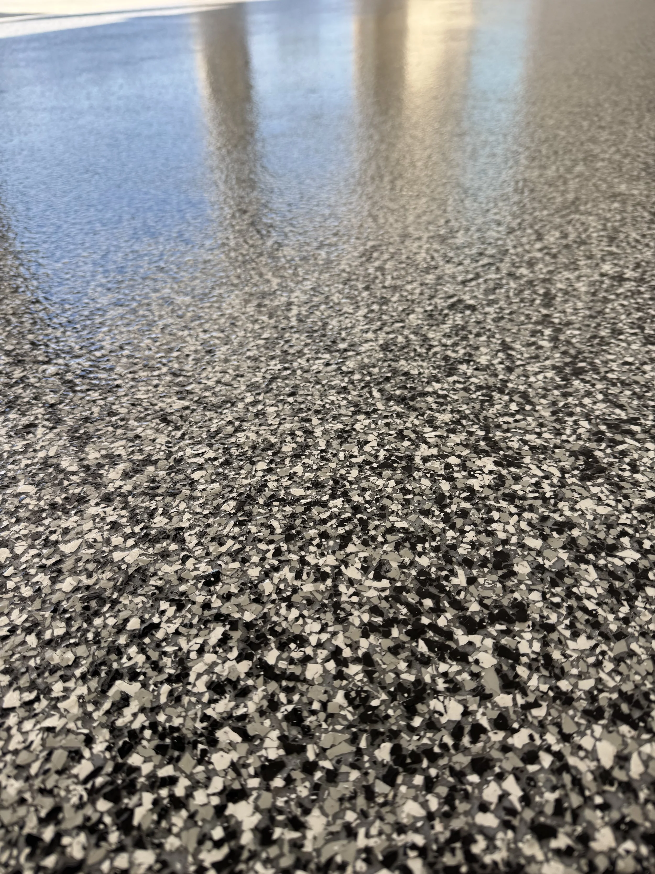 Flake flooring, also known as epoxy flake or chip flooring, is a durable and decorative coating system that combines a base layer of epoxy with colorful vinyl flakes and a protective topcoat. The flakes come in various colors, sizes, and blends to create a custom look that adds texture and visual appeal, while also helping to hide dirt, scratches and imperfections.