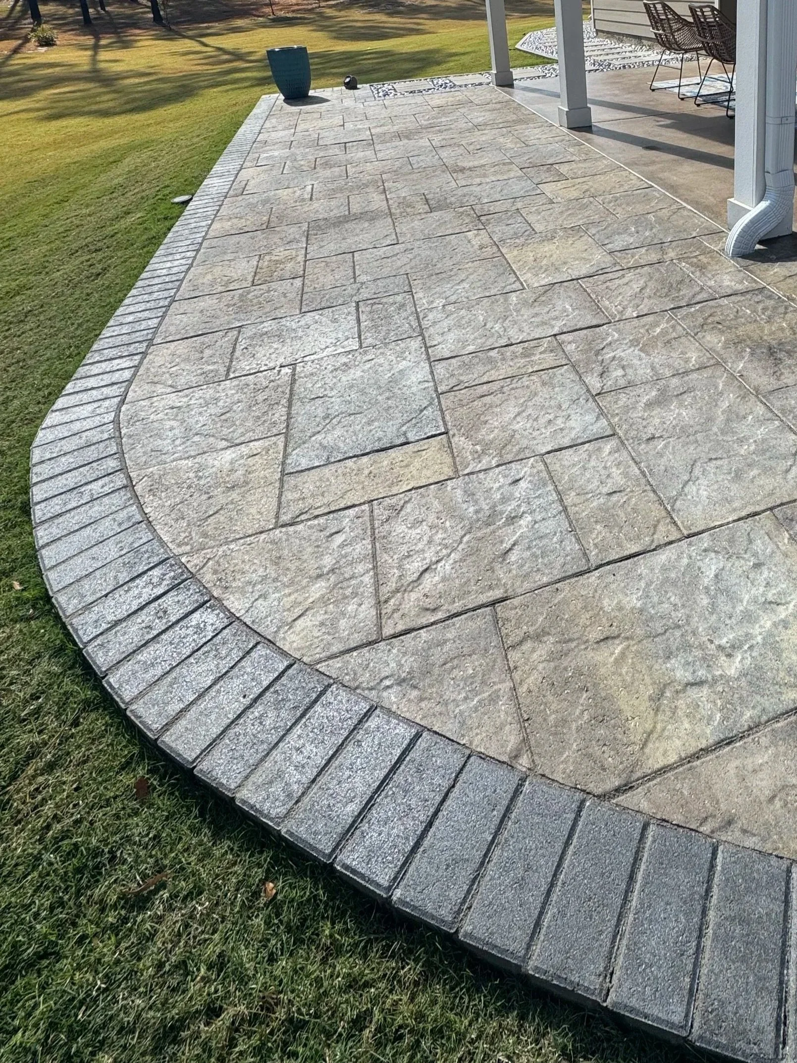 Stamped Concrete is a decorative finish that gives your concrete surface the appearance of natural stone, brick, slate, wood or other textures—all while offering the durability and strength of traditional concrete. This technique involves pressing patterns and textures into freshly poured concrete, then finishing it with color and sealant to enhance the design and protect the surface.